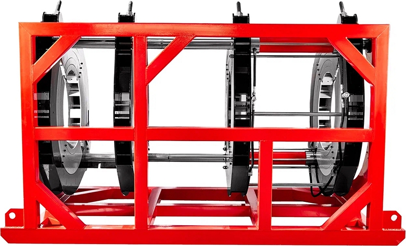 - Центраторо с гидравлическим приводом и 4-мя прочными широкими зажимами, один из которых легко может быть удален для облегчения сварки полимерных фитингов с трубами (тройники, крестовины, отводы), имеет большой запас прочности за счет качественного сплава и ребер жесткости, что позволяет сваривать полимерные трубы с любым показателем SDR