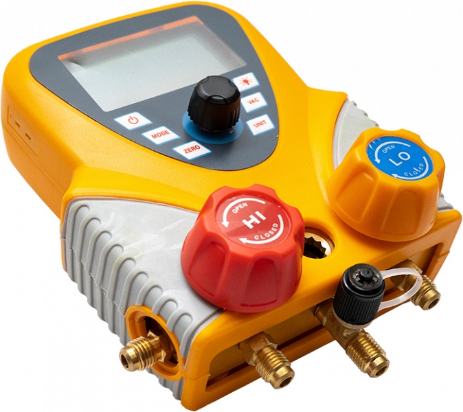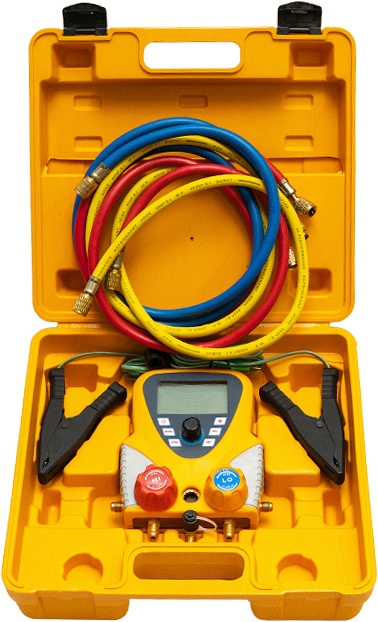 Цифровой манометрический коллектор со шлангами и клеммами в кейсе Voll V-MGC Digital (Волл В-МГЦ Диджитал) используется для измерения давления и температуры в системах кондиционирования, тепловых насосов и холодильного оборудования.